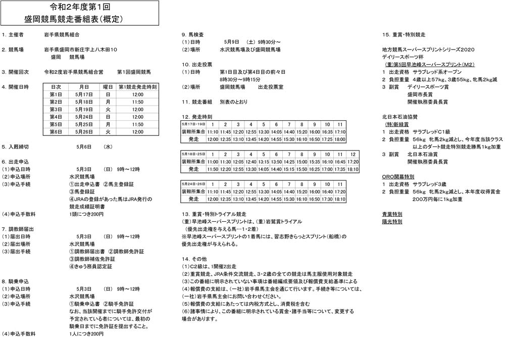 令和2年度 第1回盛岡競馬概定番組(5/17~5/26)