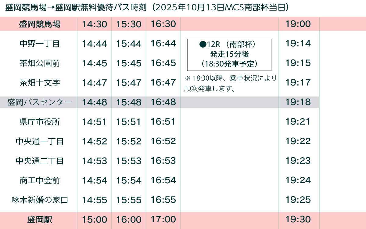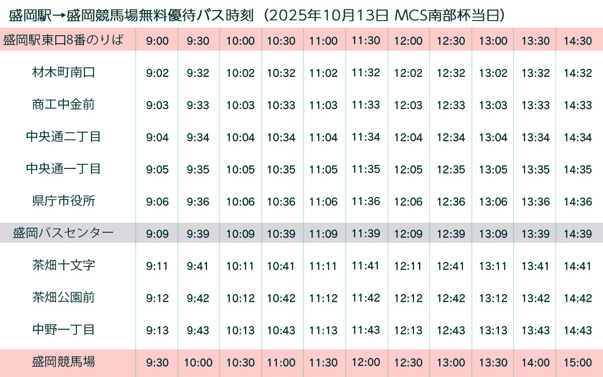 当日は周辺道路・競馬場駐車場混雑が予想されます。盛岡駅から運行される無料優待バスをご利用ください。