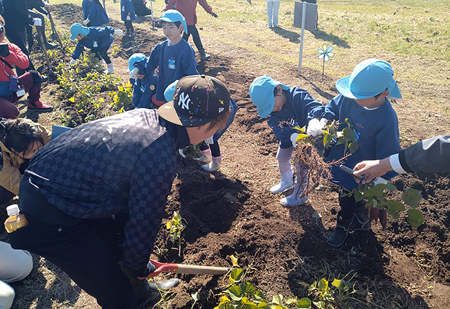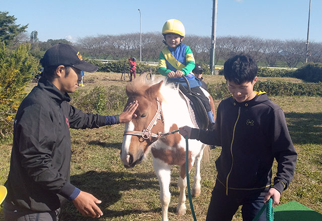 このほか、騎手の勝負服と帽子を身に着けてポニー乗馬も体験。騎手と一緒にさつまいもの収穫とポニー乗馬を体験した園児たちの歓声があがり、とても楽しい収穫祭となりました。