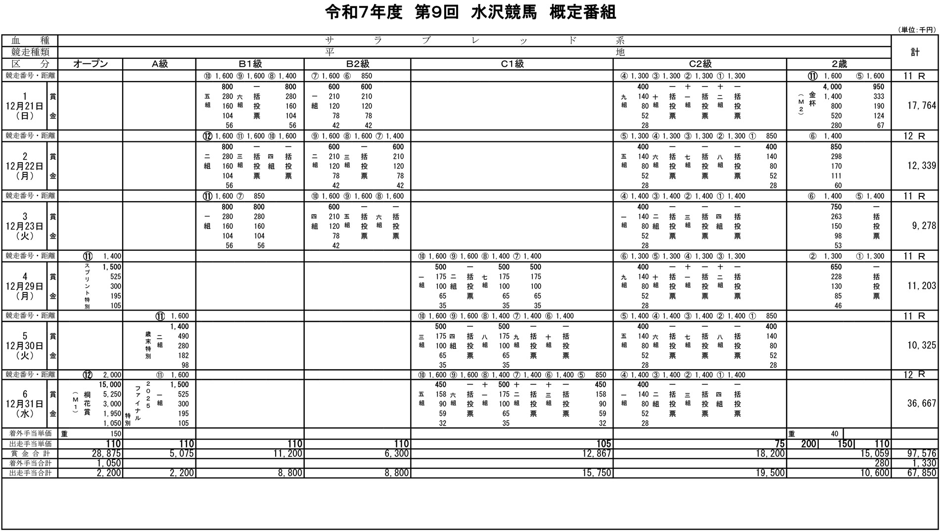 令和7年度 第9回水沢競馬概定番組(12月21日~12月31日)