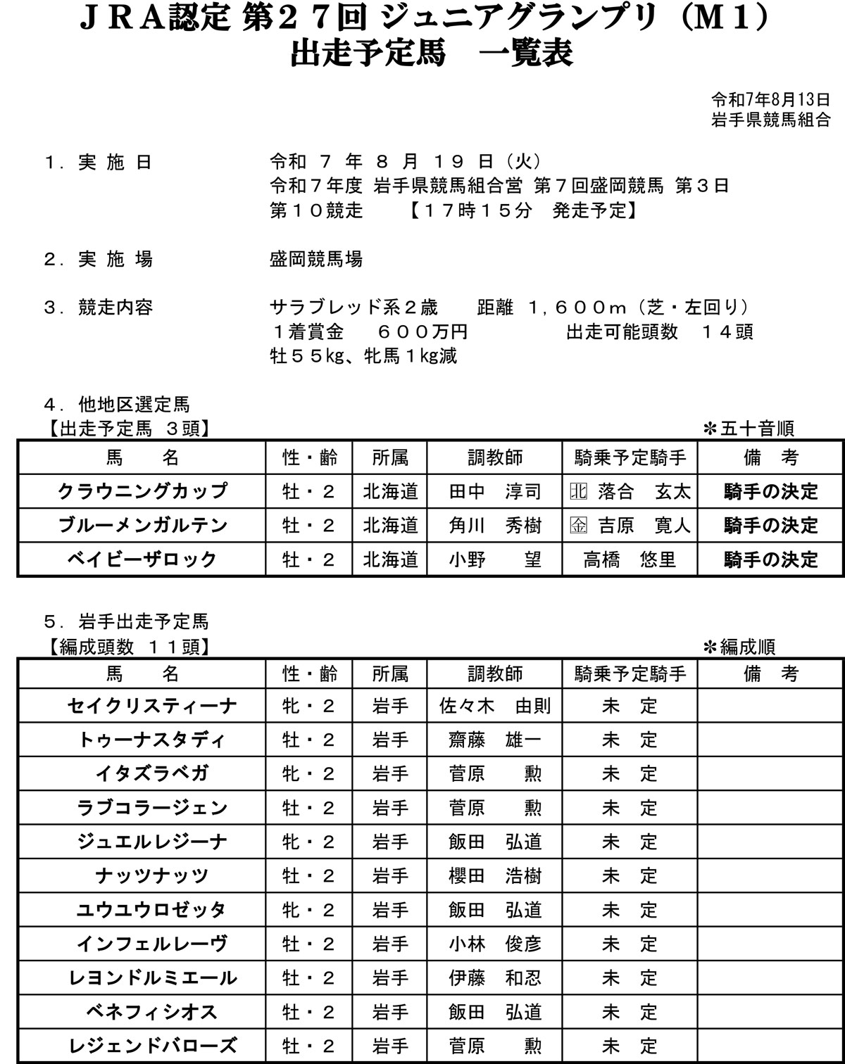 第27回ジュニアグランプリM1/地方他地区所属出走予定馬について(4)