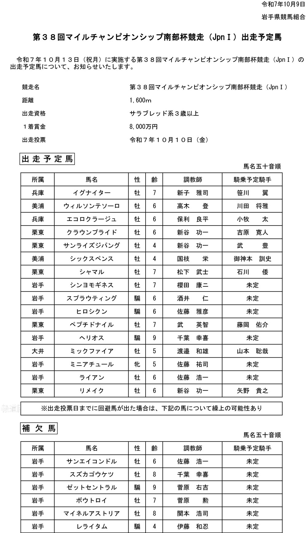 第38回マイルチャンピオンシップ南部杯JpnI競走 出走予定馬について(10月9日発表)