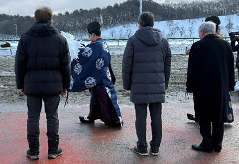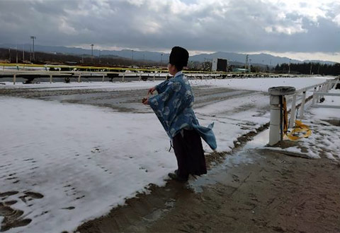両競馬場ともに多くの関係者が集まり、盛岡競馬場『馬頭尊(ばとうそん)』、水沢競馬場『馬櫪神(ばれきじん)』での“安全祈願祭”、本馬場での“馬場清め”を行い、2026年のレース、調教の安全を祈願しました。