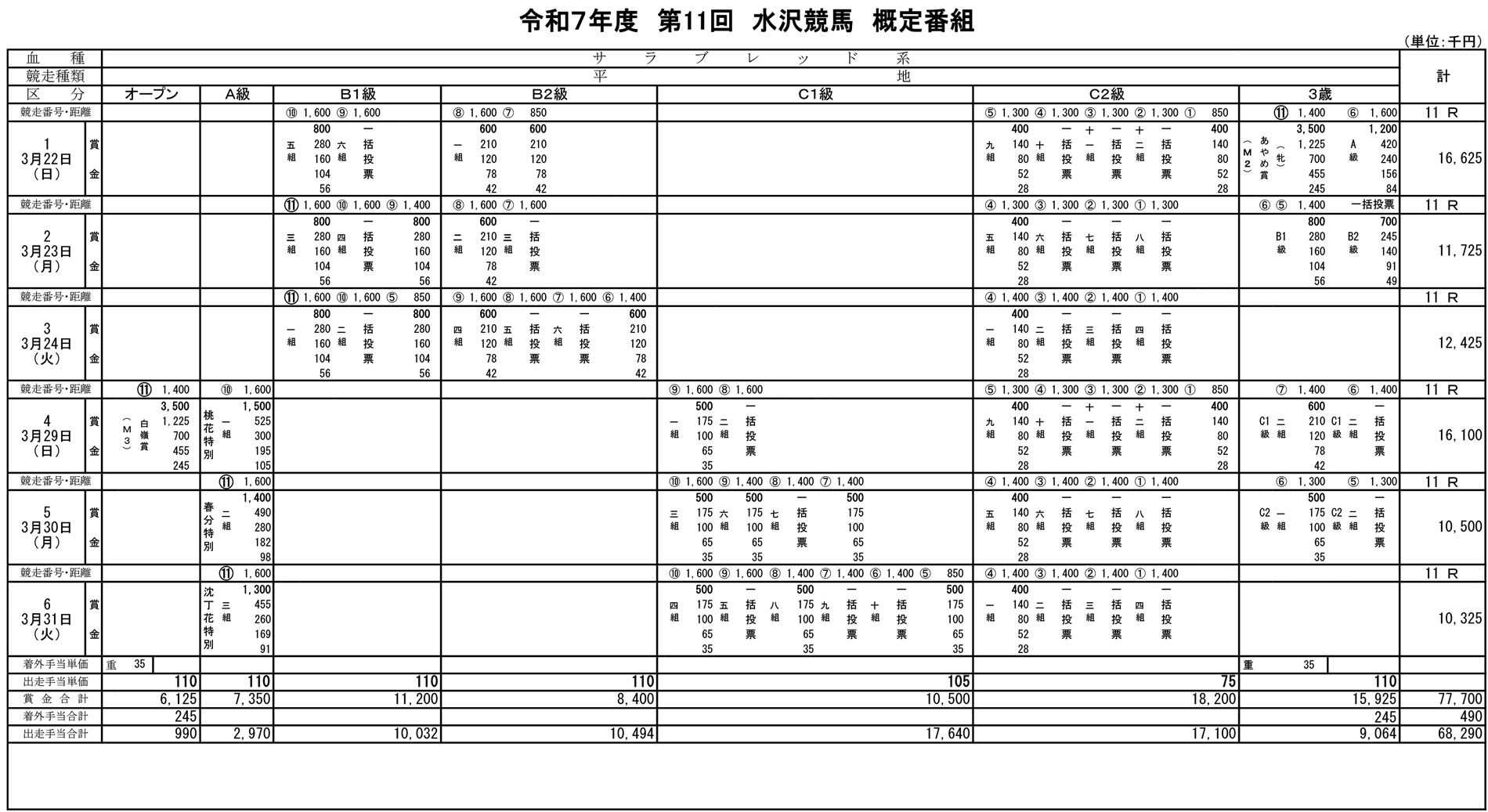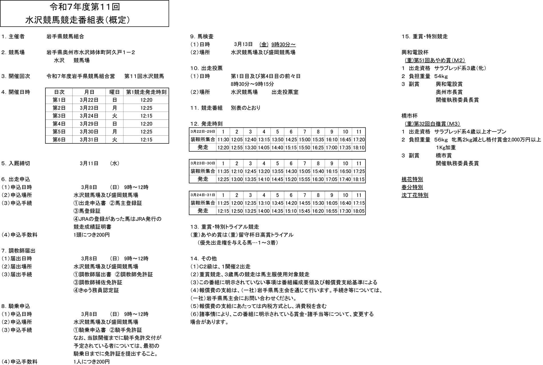 令和7年度 第11回水沢競馬概定番組(3月22日~3月31日)