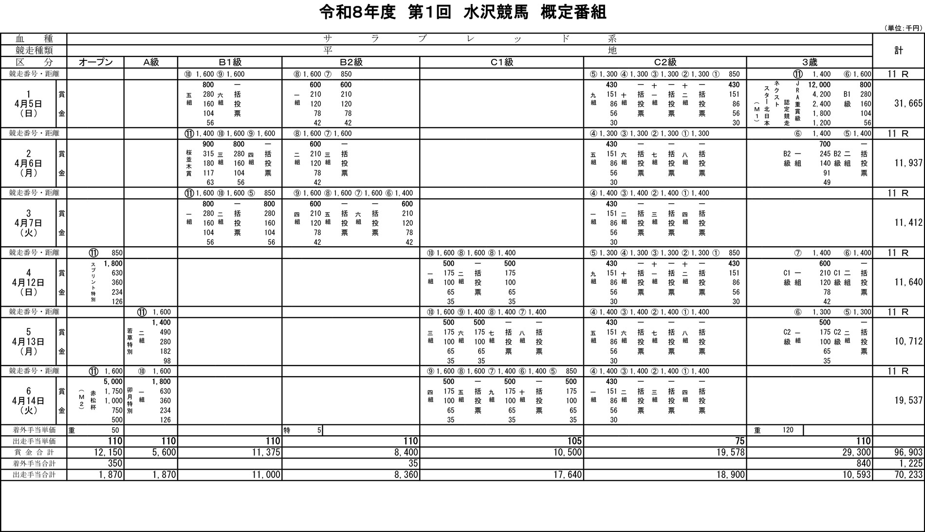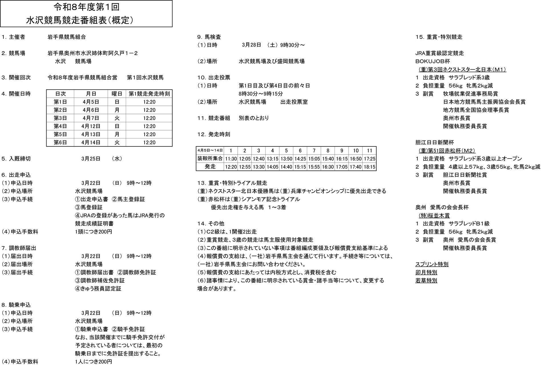 令和8年度 第1回水沢競馬概定番組(4月5日~4月14日)