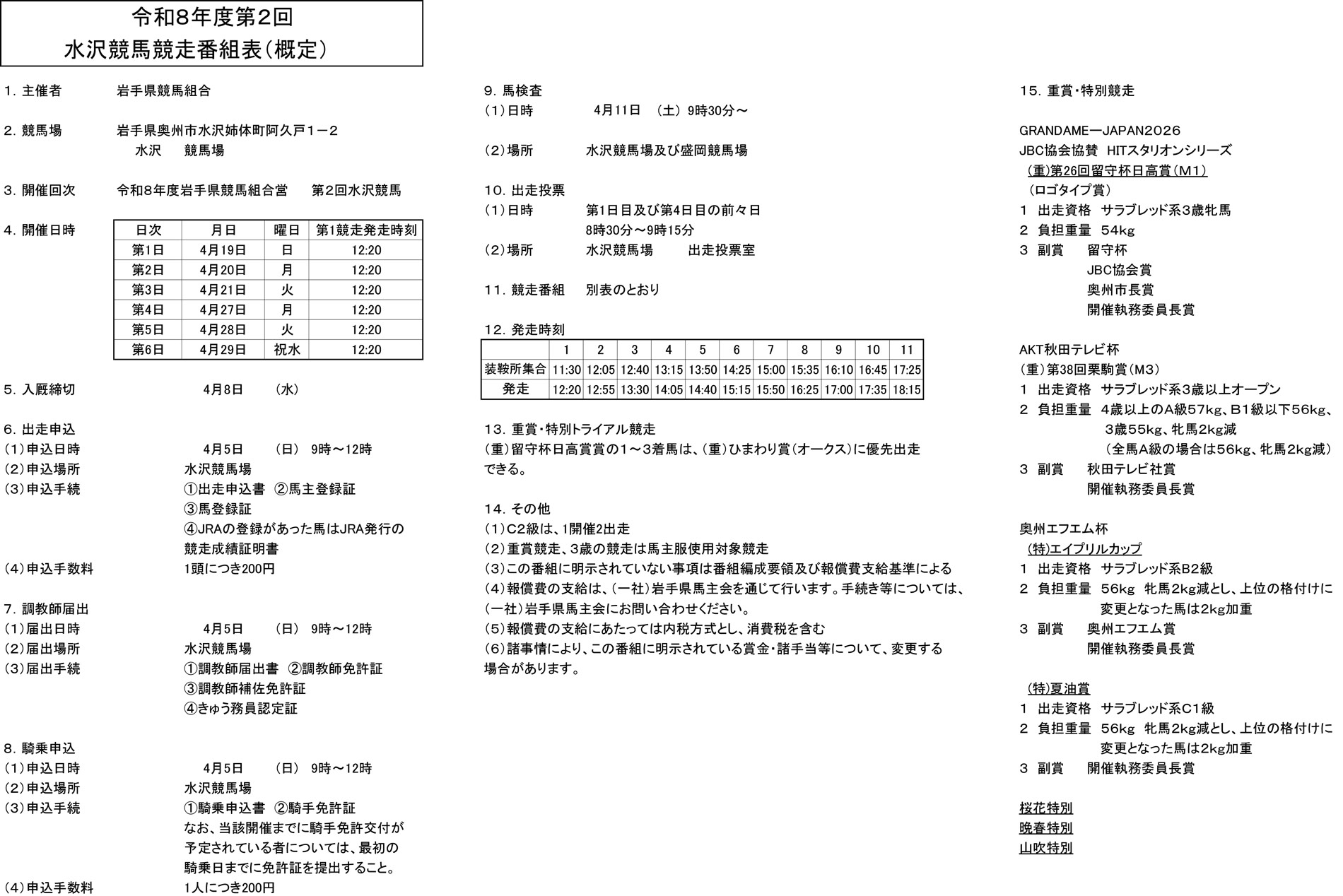 令和8年度 第2回水沢競馬概定番組(4月19日~4月29日)