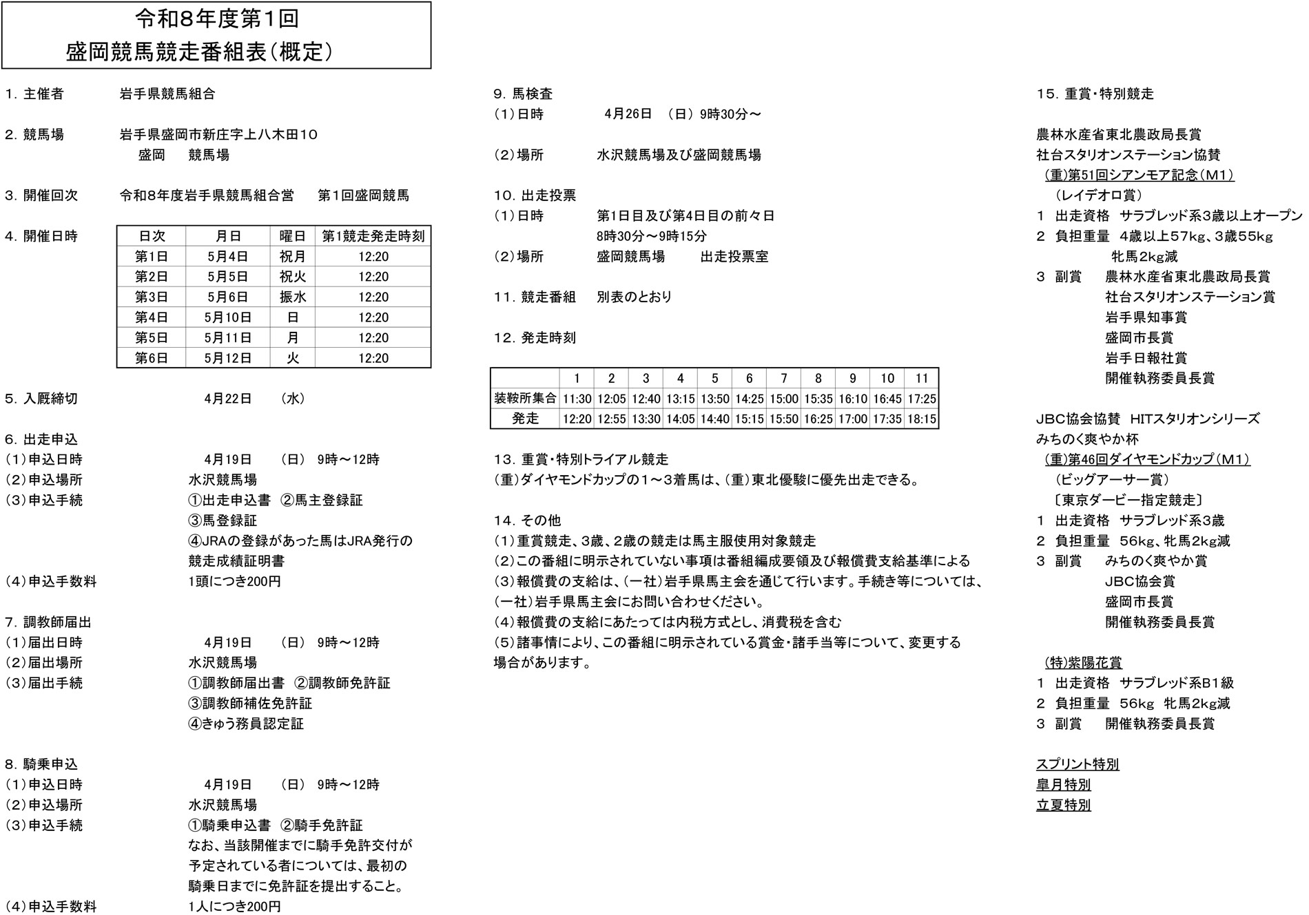 令和8年度 第1回盛岡競馬概定番組(5月4日~5月12日)