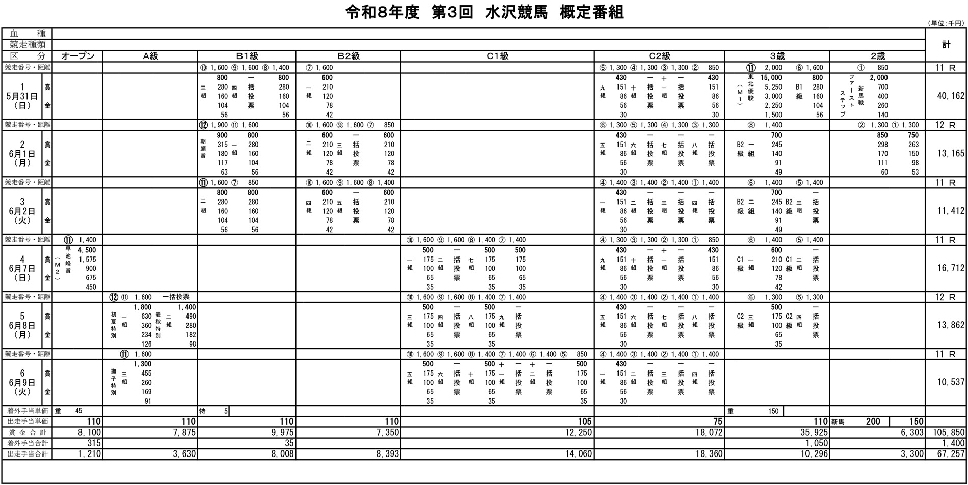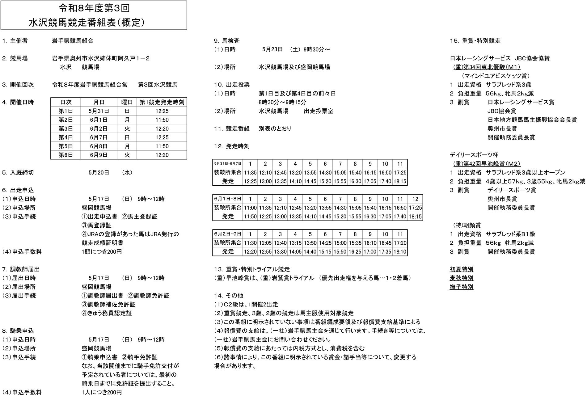 令和8年度 第3回水沢競馬概定番組(5月31日~6月9日)