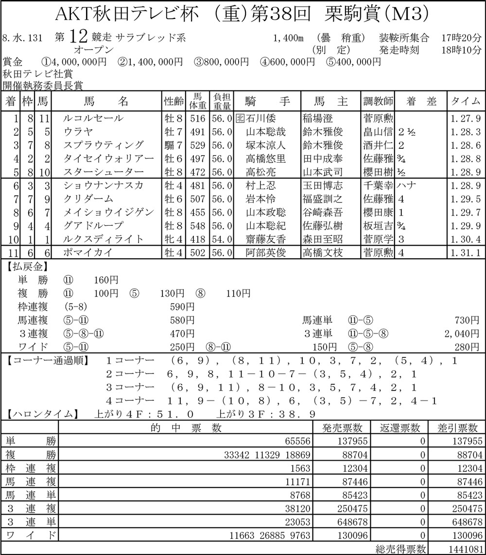 中央、高知の成績どおり走ってくれました。1600mぐらいまでなら、いい競馬ができると思います。次走予定はシアンモア記念。カナオールウェイズ、リケアカプチーノ、そして今回のルコルセールと同一きゅう舎、同一馬主さんの3頭出しで臨みます。