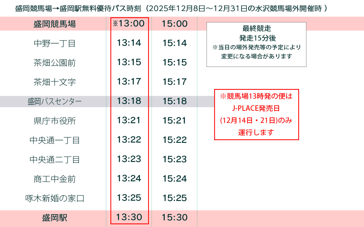 水沢競馬開催時の盛岡駅-盛岡競馬場無料優待バス時刻/2025年12月8日~12月31日